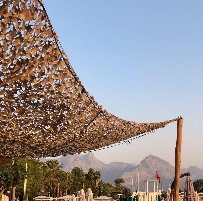 Polystraw Shade provides 70–80% sun protection with a natural camouflage look using UV-stable, water-resistant 150D fabric.